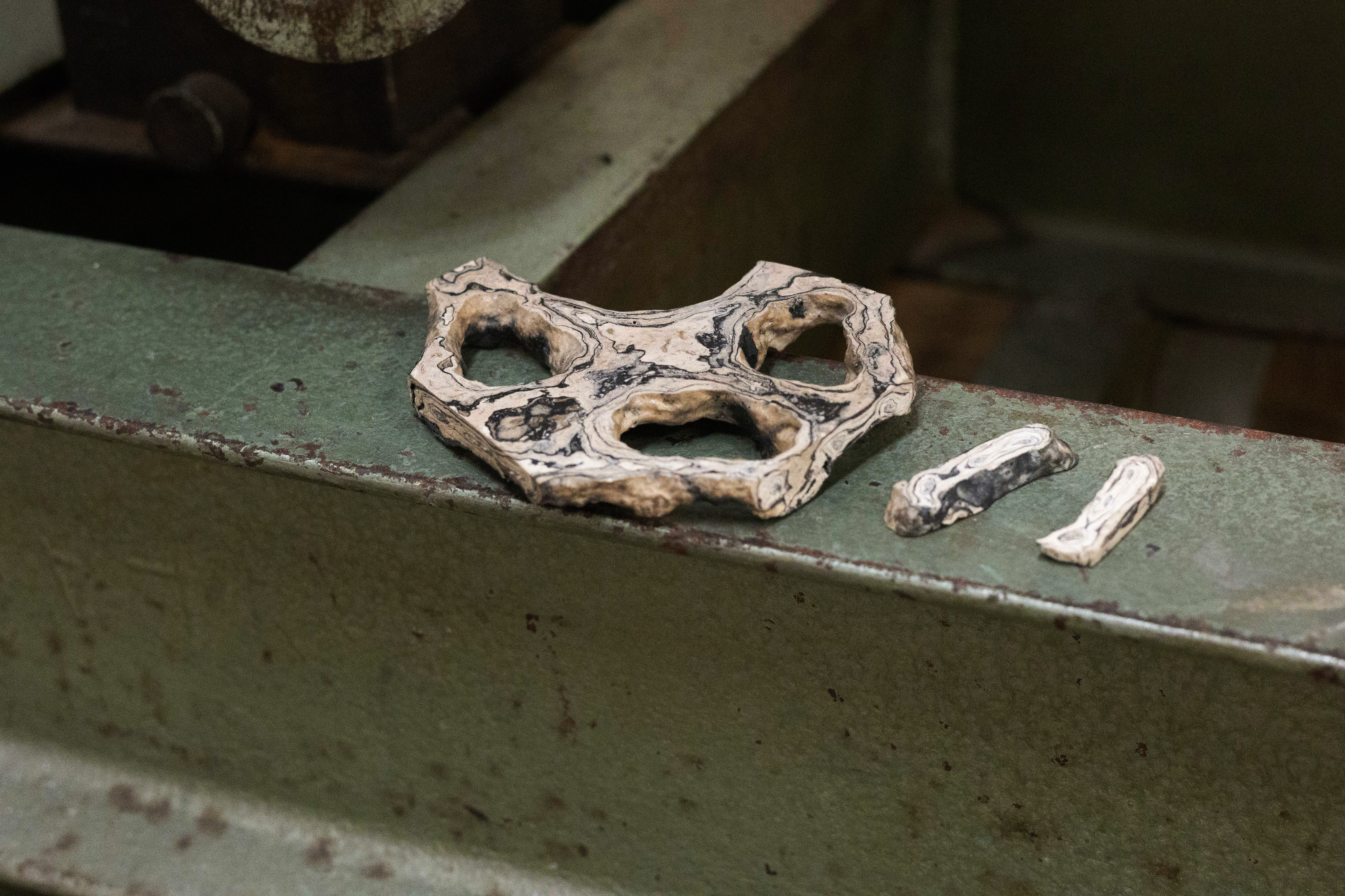 The material consists of discarded cardboard and Cassava starch sourced locally around Dalston's Ridley road market, a predominantly Caribbean and Jamaican market. Cassava or Yam is a high yield starchy tuberous root that needs little water and no pesticides to cultivate, this makes it a good candidate for bioplastics and biofuels around the world as well as being central to the diet of subtropical countries.